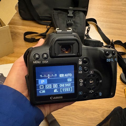 Canon EOS 1000D digitaalinen järjestelmäkamera sisältäen kuvassa näkyvät osat