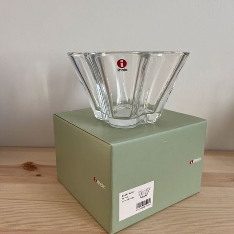 Iittala Aalto-kulho, kirkas lasi. Ei löydy mittanauhaa mutta oletan että on tuo 75 mm koko.