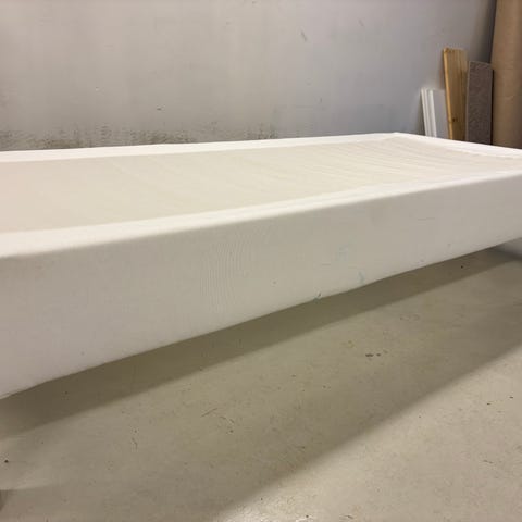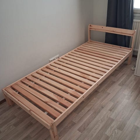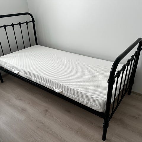 Elloksen industrial tyylinen metallinen sängynrunko. Pohjaan lisätty vaneri, alkuperäinen säleikkö sen alla, siitä muutama säle mennyt poikki. Rungon leveus n. 100cm, patja 90cm. Purettu osiin, patja ei kuulu kauppaan.