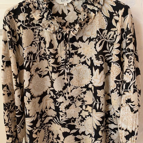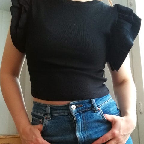 Hálon näyttävä musta pusero, koristeltu hálon O-logoilla. Kiristysnauha kaulalla (kuvissa solmittu kiinni), perhosmaiset olkapääröyhelöt ja laskokset edessä sekä hihoissa.