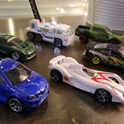 Erilaisia pikkuautoja. Paljon leikitty, mutta suurinpiirtein ehjiä