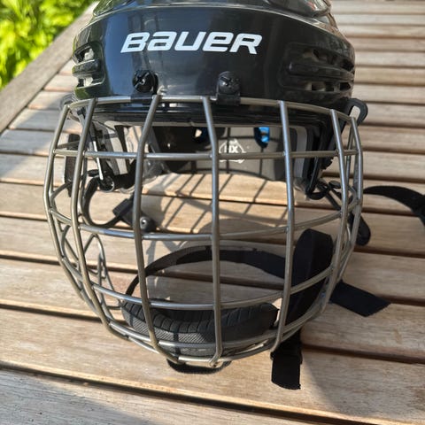 Valkoinen Bauerin Reakt 75 -kypärä ja Bauer ristikko kokoa M. Meillä ollut uudesta asti, hyvässä käytetyssä kunnossa. Täysin ehjä!