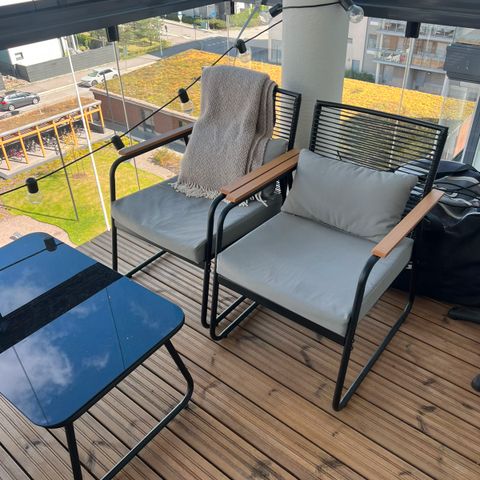 Ulkokalustesetti, joka sisältää polyrottinkisen sohvan, kaksi nojatuolia ja puisen pöydän. Kalusteissa on mustat pehmusteet ja ne soveltuvat ulkokäyttöön. Materiaalina polyrottinki ja puu. Kalusteet VEN jyskin kalusteet. Kotiinkuljetus mahdollinen pientä lisämaksua vasten.