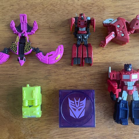 Myydään kuvan hahamot. Transformers hahmoja ja muutama muu ukkeli. Lelut ovat muovia. Transformer hahmoja saa väännettyä autoiksi.
