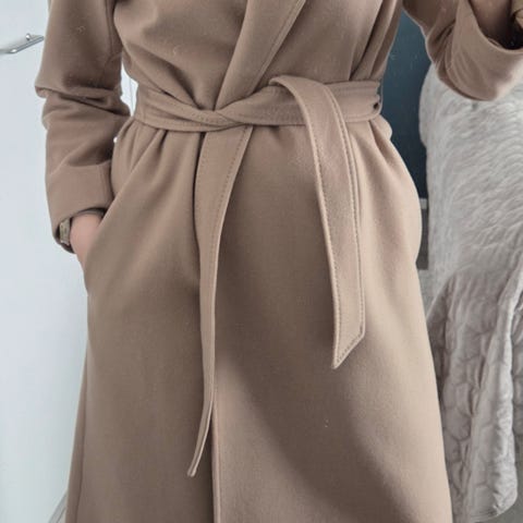 Ajaton ja siisti malli, käännekaulus ja vyö korostavat kauniisti vartaloa.
