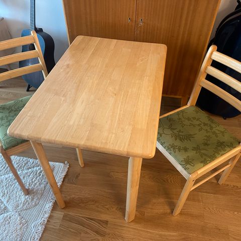 Ruokapöytä ja kaksi tuolia. Siistissä kunnossa pöydän pientä kulumaa lukuunottamatta. Nouto Tampellasta.