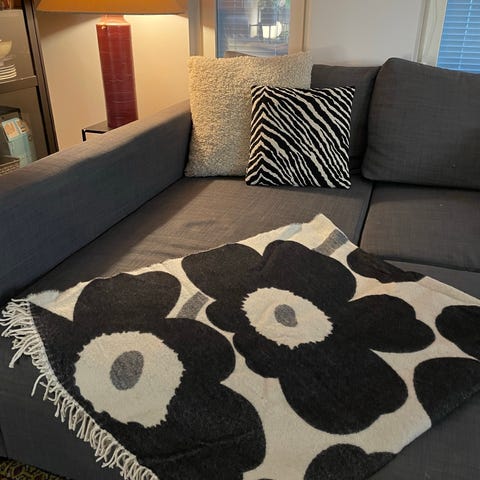 Jacquard-kudottu Unikko-kuosinen huopa on valmistettu luomupuuvillasta ja siinä on lyhyet hapsut joka sivulla. Kuosin värit ovat päinvastaiset huovan toisella puolella.