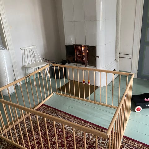 Retro pikkulasten leikkikehä myytävänä. Materiaali puuta. Päältä maalattu aikanaan. Ehjä. Taittuva malli.