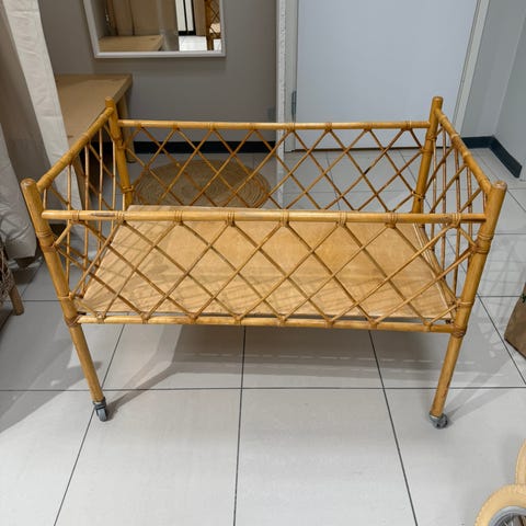 Seuraavalle vauvalle ihana renkailla liikuteltava rottinkisänky ja patja. Sisältää mobilen pidikkeen.