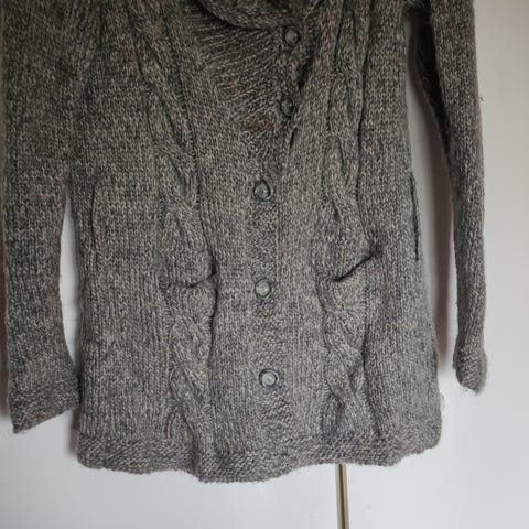 Itse tehty neuletakki, materiaali suurimmaksi osaksi tai kokonaan villaa. Lämmin, mutta suht kevyt, istuu nätisti joka puolelta S-M kokoiselle: kai-kai 44 (joustaa) ja pituus 93. Vyö ja etutaskut. Siisti ja vähän käytetty, ei lainkaan nyppyyntynyt. Neulottu tosi siististi, käsityön jälki näkyy napinlävissä (lähinnä ylimmässä, tästä kuva).