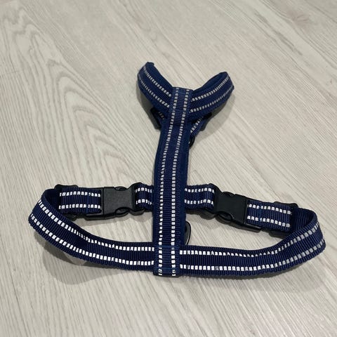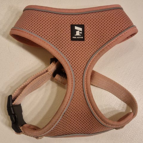 Feel Active Padded säädettävät valjaat kokoa S (koiran rinnanympärys 50-60cm, valjaiden kaulanympärys 40-49, valjaiden rinnanympärys 41-61). Valjaissa heijastimet, jotka näkyvät hyvin pimeässä. Lukitus ja kiinnityslenkit ehjät ja toimivat. Valjaat pesty hajusteettomalla pesuaineella, mutta tummentumia jäänyt.