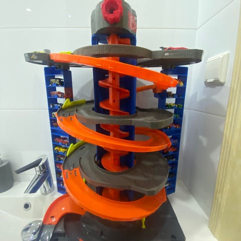 Korkein Hot Wheels parkkitalo, tilaa yli 100 autolle. Mukaan 40 autoa, kaikki ei Hot Wheels sarjaa, mutta pikkuautoja.