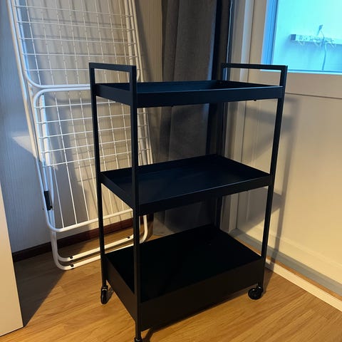 Vanhempaa mallia oleva IKEA Råskog tarjoiluvaunu. Eroaa uudemmasta jokaisen hyllyn olevan samankokoiset. Pientä käytönjälkeä.