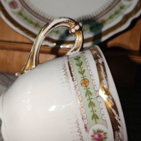 Astiastasto 6:lle. Harmittavasti yksi kuppi on rikki mutta sen saa kaupanpäälle. Sopii koristeeksi tai mosaiikkitöihin. Mutta muut osat on ehjiä ja nättejä. Vain nouto Nurmijärvi/Hyvinkää.