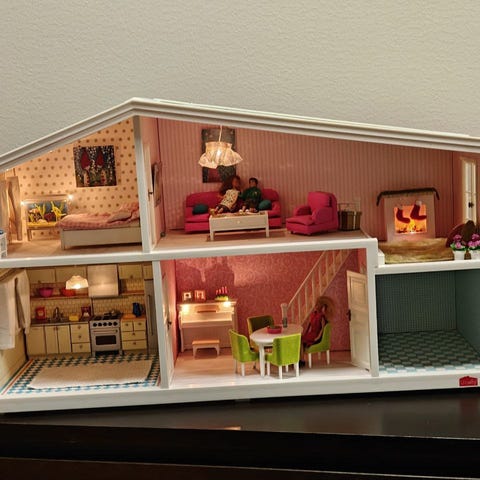 Lundby nukkekoti, jossa kolme kerrosta ja useita huoneita. Mukana erilaisia huonekaluja, kuten keittiön, makuuhuoneen, lasten huoneen, kylpyhuoneen sekä olohuoneen kalusteet. Alimman kerroksen saa irti, myös portaat saa irrotettua. Mukaan monta sähköjohtoa ja kaksi lamppua.