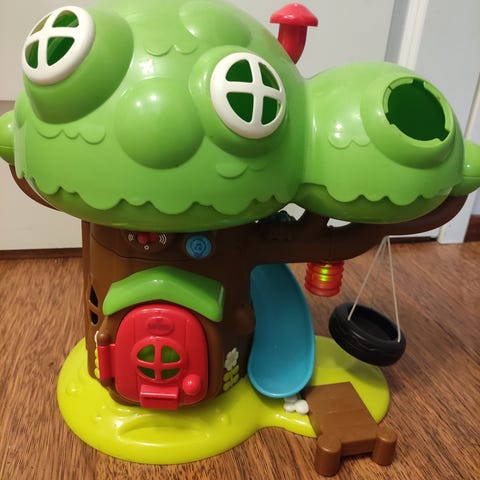 ”Palapeli” talo. Sisältää eri muotoisia ja värisiä paloja. Lelun tarkoituksena on auttaa lapsia tunnistamaan muotoja ja kehittää motorisia taitoja. Materiaalina on puu ja maalatut pinnat.