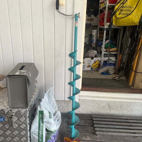 Heinola jääpora, käsikäyttöinen malli, jossa punainen poranterä ja metallinen varsi. Soveltuu jäälle poraamiseen kalastusta tai muita aktiviteetteja varten.