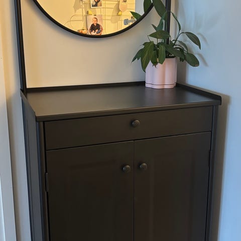 Musta peilipöytä, peili ja laatikot molemmin puolin.