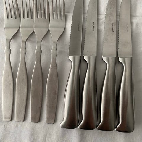 Hackman Gourmet aterinsetti, joka sisältää 12 osaa: 6 pihvi/pizzaveistä ja 6 haarukkaa. 2 paria avaamattomassa paketissa, muita vähän käytetty. Valmistettu mattaharjatusta ruostumattomasta teräksestä, sopii päivittäiseen käyttöön ja kestää konepesun.