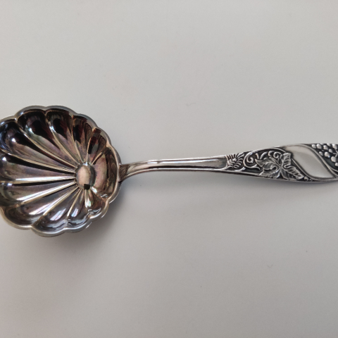 Tuntemattoman valmistajan koristeellinen lusikka, jossa on yksityiskohtainen vihaisen lapsen tai vanhuksen kuva kahvassa. Mahdollisesti peukalo suussa. Lusikka on valmistettu alpakasta. Pituus arviolta 15 cm. Lusikoi tällä erikoisella aterimella vaikka aamupalaksi jugurttia ja tulet melko varmasti hyvälle tuulelle.