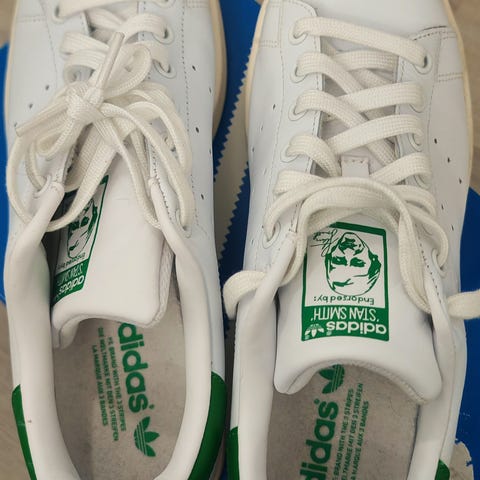 Adidaksen nahkaiset Stan Smith -tennarit (40, UK 6,5) ovat uudet eli täysin käyttämättömät. Niissä on yhä laput kiinni. Ovh on 120 €.