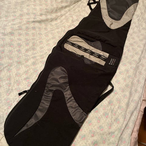 Käyttämätön lumilautapussi, väri harmaa-musta. Kanto- ja olkahihnat. Pituus 165 cm ja korkeus 35 cm.