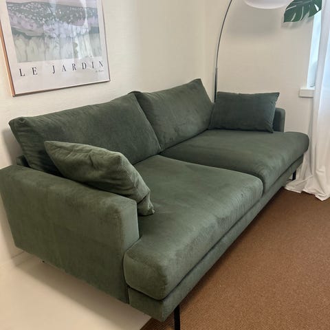 Mikrokuitukankainen ruskea sohva. Vähän tummempi ruskea, kuin miltä kuvissa näyttää.