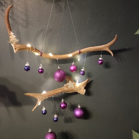 Myydään poronsarveen tehty joulukoriste valoilla.