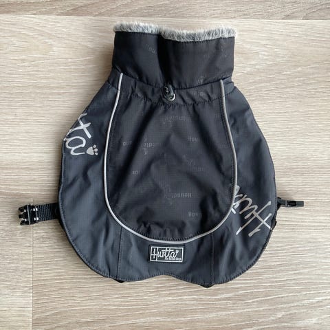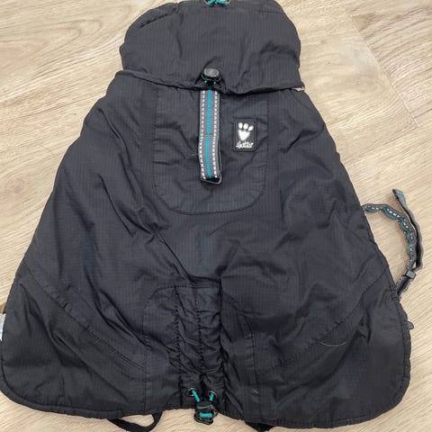 Hyväkuntoinen koiran takki, koko 25. Selässä hihnan kiinnityslenkki.