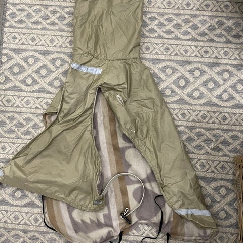 Pari kertaa päällä ollut koiran takki, suht paksu ja lämmin. Ollut omalla 20kg painavalla koiralla. Puhdistan karvoista mahdollisimman huolellisesti ennen myyntiä.