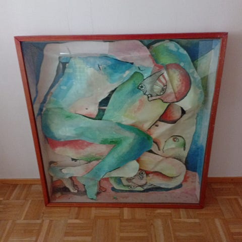 Mikko Männistön 1984 tekemä vesivärimaalaus, jossa kohokuvioita. Korkeus n. 147 cm, leveys n. 136 cm, syvyys kehyksessä n. 5,5 cm ja uloimmillaan n. 10 cm.