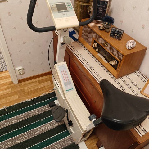 Gymstick kuntopyörä, meille käytettynä tullut, mutta jäi nurkkaan. Satulassa kulumaa, vastukset ei toimi. Näyttö toimii.