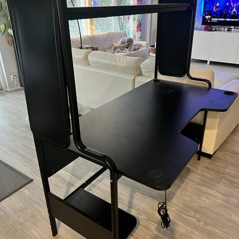 Myydään tilanpuutteen vuoksi. Vasem. Puolella on peltipala ottanut osumaa, mutta ei vaikuta kuin kosmeettisesti läheltä katsottuna. Toisella puolella ei ole koskaan ollut ummessa. Mahtuu kaksi näyttöä ylemmälle tasolle ja perus mukavuudet, kuten kuulokkeille omat naulakot, mukiteline, alhaalle mahtuu itse kone ja vaikkapa toiselle puolen minijääkaappi kuten kuvassa.