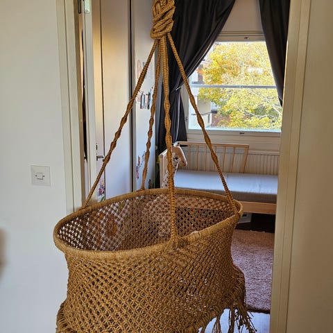 Vauvan keinu / kehto. Tähän saa sylivauvan kätevästi keinumaan ja suojaan lattialta. Pohjalle voi laittaa halutessaan ovaalinmuotoinen patjan (meillä ollut vain peittoa ym. pehmusteena). Myös viehättävä sisustuselementti.