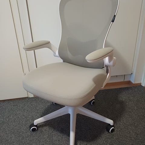 Erittäin siisti, tukeva, hyvät säädöt. Voi säätää korkeutta ja istuinosan paikkaa. Selkänojan keinunta on tästä mallista jätetty pois, joka tukevoittaa tuolia.