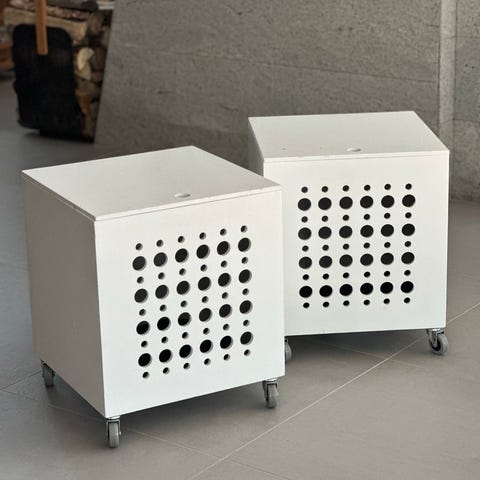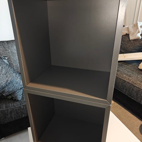 Myynnissä valkoinen hylly, renkailla joten helppo siirtää paikasta toiseen. Neljä saman kokoista laatikkoa, puun väriset. Vasemmalla puolella halkeama, oli jo ostettaessa eikä vaikuta käyttöön. Hyllyn päällä ollut kukkaruukku on aiheuttanut pienen kosteus vaurion. Hyllyssä siis kosmeettisia vikoja jotka ei kuitenkaan vaikuta käyttöön ollenkaan.
