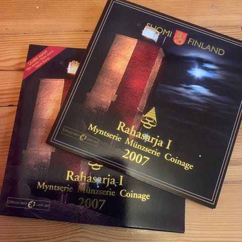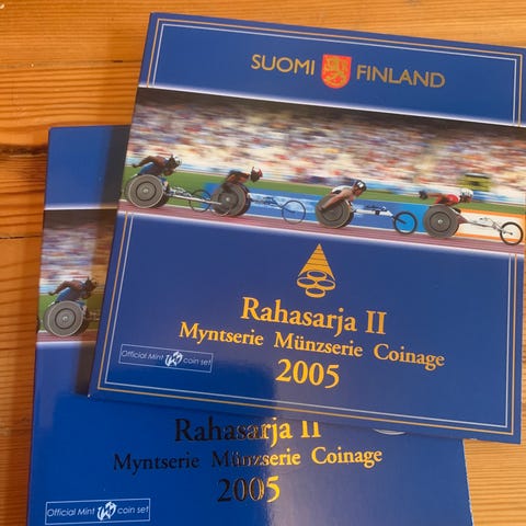Rahasarja 2005/I Suomi. Vuosilajitelma sisältää kaikki Suomen kahdeksan eurokolikko leimakiiltoisina, yhdestä sentistä kahteen euroon.