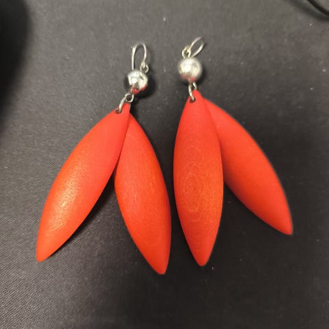 Aarikka Jalava-korvikset mustassa värissä. Isot ja näyttävät. Pituus koukun kanssa n. 9cm. Koukut hopeaa, muut metalliosat korumetallia ja puuosa vaahteraa. Siistikuntoiset.