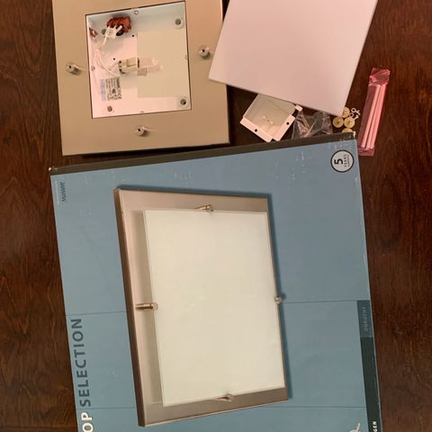Annetaan kaksi valaisinta. Toinen (lasinen) ollut seinävalaisimena, toinen (muovinen) kylpyhuoneen kattovalaisimena.