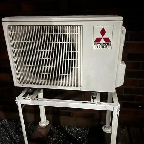 Mitsun Ecodan lämpöpumppu. Laitteessa näkyvissä kupariputket ja liitännät. Käytetty, soveltuu lämmitysjärjestelmiin. Vaatii toimivan ulkoyksikön jos haluaa suuremman hyötysuhteen.