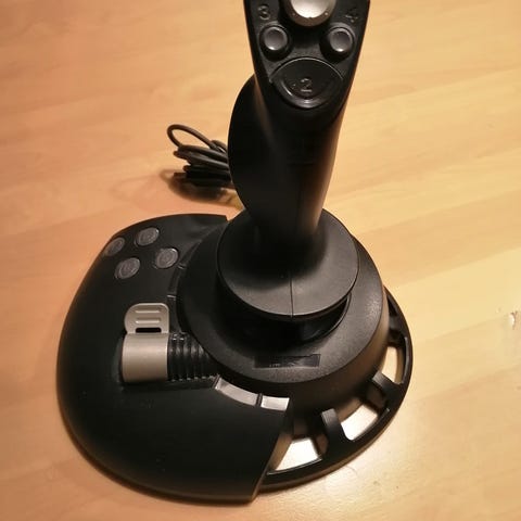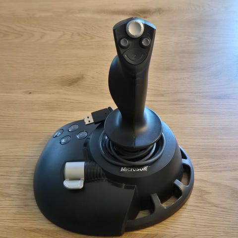 Myydään Microsoft SideWinder Force Feedback 2 USB-joystick myyntilaatikkoineen vuosituhannen vaihteesta. Napit on testattu toimivaksi Windows 11:n testausympäristössä. Laitteeseen tulee virta ja moottori käynnistyy, mutta itse Force Feedback -toimintoa ei ole kokeiltu sopivan ohjelmiston puuttuessa.