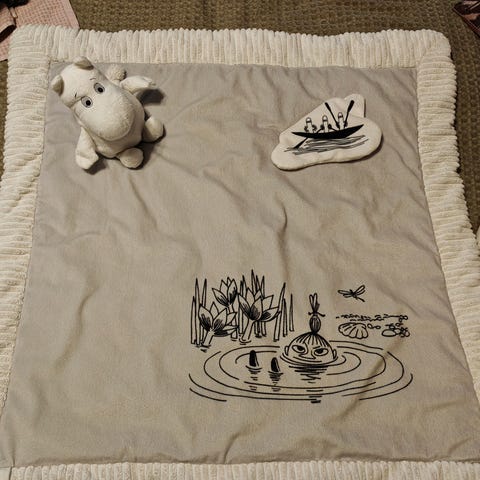 Vauvan muumi leikkimatto, jossa on pehmeä alusta ja roikkuvia leluja. Leikkimatto sisältää erilaisia tekstuureja ja leluja, jotka stimuloivat aisteja. Väri on harmaa ja valkoinen, ja materiaali on pehmeää kangasta. Käytetty, mutta siisti ja hyvässä kunnossa oleva. Ainoa vika on yksi rikkinäinen lelun ripustuslenkki. Rikkoontui vanhemman lapsen vetäessä kovin roikkuvaa lelua. Muuten lenkit ovat kestäneet hyvin vauvan leikkejä.