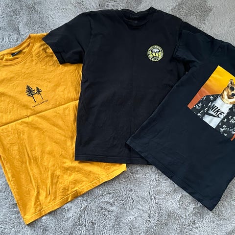 TUPSin logolla varustettu tuulitakki, t-paita ja pitkähihainen paita, jonka alareunassa numero 8. Takki ja paita kokoa 129-137. Koiratalous