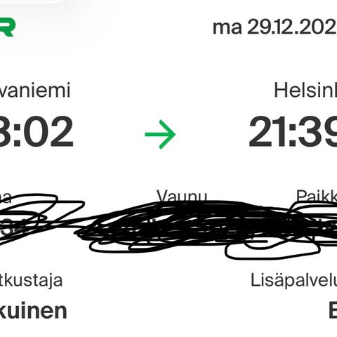 Meno 3.1. Hki 8.00 - Rovaniemi 9.25 ja paluu 8.1. Rovaniemi 21.00 - Hki 22.20 (hinta sis. nimenmuutoksen molempiin suuntiin yht. 130 euroa). Toimitus sähköpostitse.