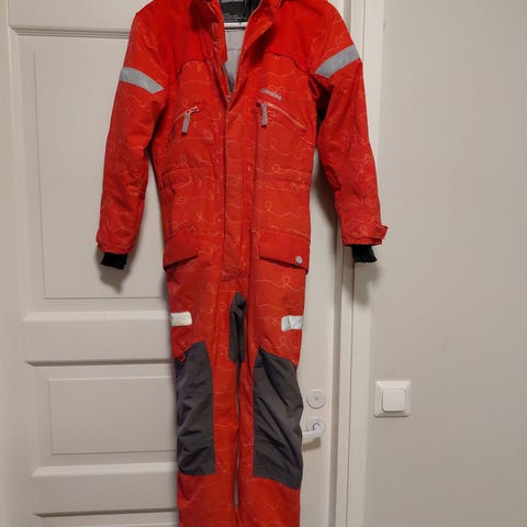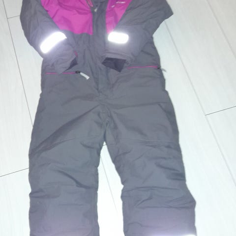 Lämmin ja mukava talvihaalari talven leikkeihin. Haalarin hihojen ja lahkeiden suussa pientä kulumaa. Koiratalous