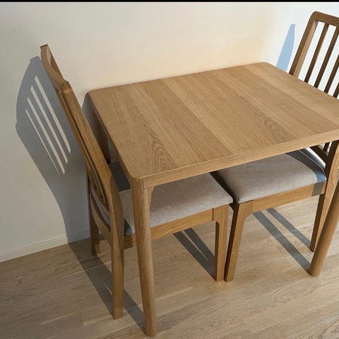 Pöytä Ikeasta, tuolit 2kpl Jyskistä. Pöydässä pieni, lähes huomaamaton kolhu. Tuolit erinomaisessa kunnossa, istuintyynyt saa mukaan.
