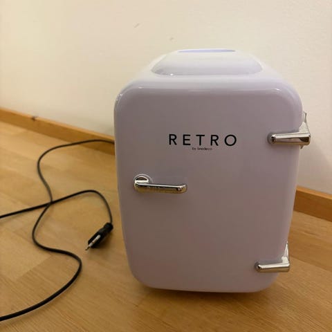 DeskChiller Minijääkaappi sininen. Pieni ja kompaktin kokoinen jääkaappi, sopii pienten juomien ja elintarvikkeiden säilytykseen. Väri sininen, materiaali ei määritelty. Sisältää sähköjohdon, kuuman ja kylmän asetuksen ja voidaan yhdistää autoon, mutta ei ole autoon johtoa.