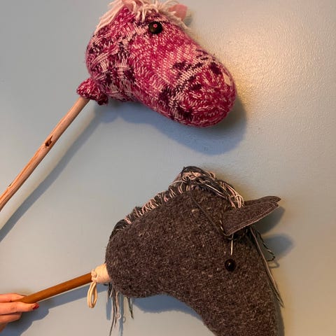 Kaksi kuvan mukaista siistiä ja joululahjaksi kelpaavaa keppihevosta. Press here-napista painamalla kuuluu laukka-ääni ja hirnuntaa. Korkeus noin 70cm.