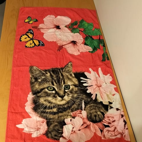 Paksu kylpytakki kokoa M, fleece kylpytakki kokoa S, matto, suihkugeeli lähes täysi, selänpesin käyttämätön, pesuhanska. Kaikki vitosella.