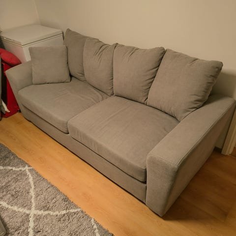 Vuodesohva on täydellisessä kunnossa. Tumman harmaa. Kolme irtotyynyä. Todella hyvä nukkua.